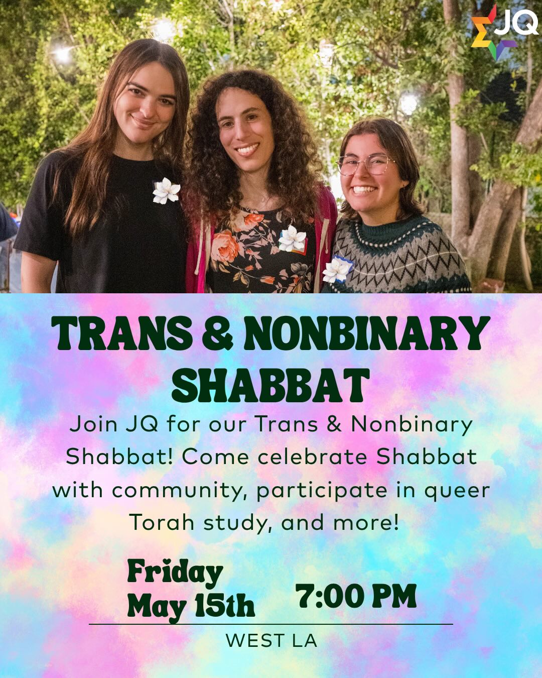 JQ is a 501(c)(3) non-profit organization whose mission is to celebrate and strengthen queer Jewish life through community building, educational programs, and support services creating a joyful and healthy future for LGBTQ+ Jews and their loved ones.